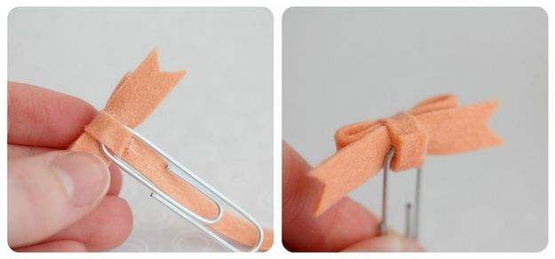 Третий отрезок фетра приклейте по центру бантика, спереди. Получается, что вы вроде бы перевязываете бантик, проводя полоску сверху вниз. Затем края третьей полоски заведите за скрепку, чтобы прикрепить, таким образом, к ней бантик.