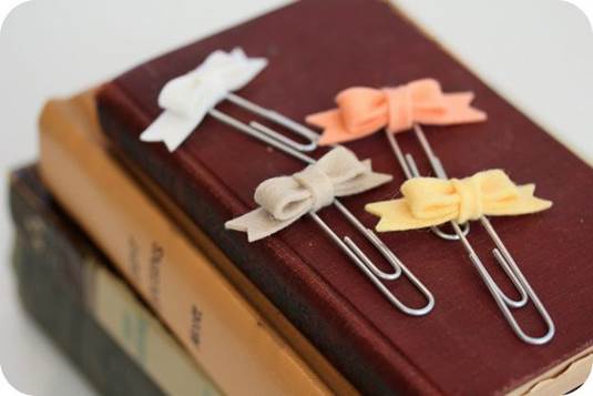 Если в вашем доме все еще пользуются популярностью обычные бумажные книги, этот мастер-класс - для вас! С нашим бешеным темпом жизни мало кому удается прочесть книгу «на одном дыхании», не помечая страницы, на которой чтение прервалось. Ну а делать эти пометки, естественно, удобнее всего специальными закладками. Вы можете сделать закладку из кусочка бумаги, денежной купюры или автобусного талончика, но приятнее всего будет пользоваться книгой с рукодельной закладкой. Некоторые мастерицы вышивают закладки, некоторые - плетут нежнейшее кружево, которое не деформировало бы страницы. Ну а вы можете воспользоваться этим рукодельным уроком и смастерить простые закладки из скрепок и кусочков фетра! Для изготовления одной такой закладки вам понадобятся: обрезки фетра, канцелярская скрепка, горячий клей, ножницы. Постарайтесь подобрать красивую скрепку, которая бы не испортила книжных страниц. Как сделать закладку из фетра? Описание работы. Положите перед собой скрепку. Ее длина будет своеобразным измерителем отрезков фетра. Отмерьте длину скрепки и вырежьте из фетра узкую полоску такой же длины. Затем отрежьте вторую полоску, ровно вдвое длиннее, чем первая. Выкроите из фетра третью полосу - чуть длиннее, чем первая. Для одного бантика понадобятся только три полоски.