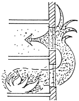После возникновения горение может распространяться, при этом образуются изолированные очаги - очаги, непосредственно не связанные с основной зоной горения. Образуются они за счет передачи теплоты на смежные постройки, сооружения, части здания радиацией, конвекцией, теплопроводностью, при попадании горящих углей, искр на горящие материалы вне зоны горения (рис.1.7). Варианты возможного распространения пожара в здании приведены в параграфе 2.2.3 второй главы настоящего Пособия. Рассмотрим основные ситуации, в которых возможно образование вторичных изолированных очагов. 1. Конвекция (от лат. Convectio – привнесение, доставка) – перемещение микроскопических частей среды (газа, жидкости), приводящих к массо- и теплообмену. Конвекция возникает сразу, как только начинается горение и в очаговой зоне повышается температура. Причиной возникновения естественной конвекции является перемещение нагретых и холодных частиц, происходящее вследствие разной их плотности. Действие конвекции стимулирует подсос воздуха в зону горения, он же способствует развитию начинающегося пожара.