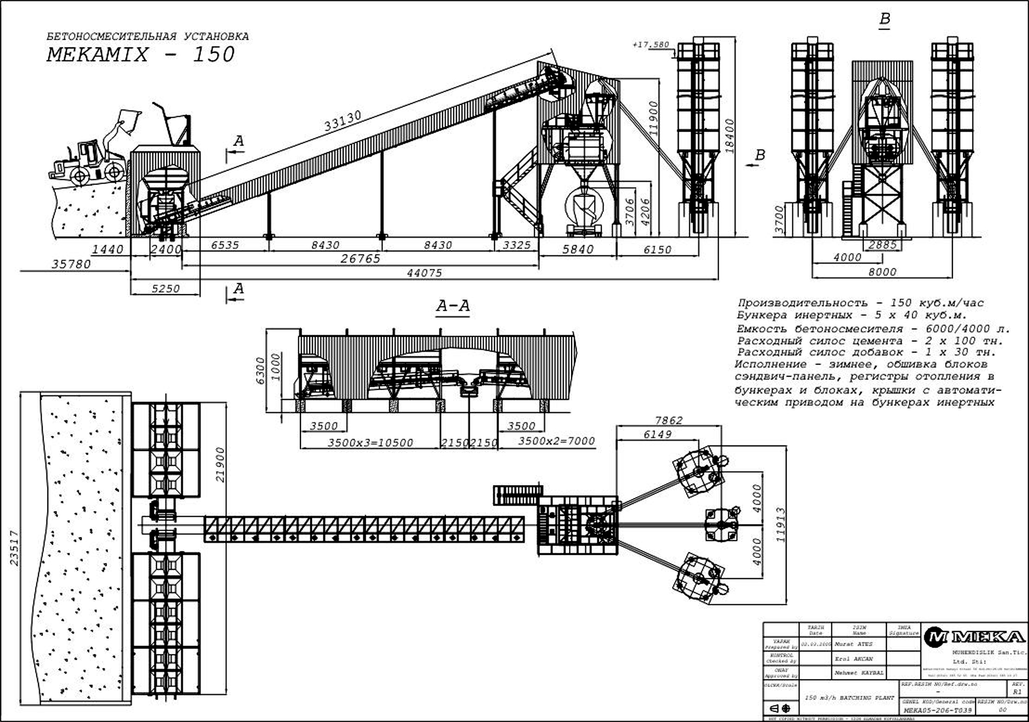 Мы рассмотрели предлагаемые заводами закладочные комплексы, комплекс MEKAMIX-150 который представлен на (рис.3.3), удовлетворяет всем требованиям, для того, что бы его можно было использовать для приготовления твердеющей закладочной смеси на уранодобывающем предприятии «ОАО ППГХО». Закладочный комплекс MEKAMIX-150 выпускает фирма " Мека Engineering Industry Co Ltd" (г. Анкара, Турция) - это одного из ведущих мировых производителей стационарных, передвижных и мобильных всесезонных бетоносмесительных установок. MEKAMIX-150 - это стационарный, полностью автоматизированный бетонный завод всесезонного исполнения. Завод компактен, прост в эксплуатации и надежен. Обладает высокой производительностью до