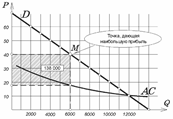 Если же спрос на продукт монополиста высокоэластичный и кривая спроса имеет пологий вид (рис. 3.6.6), монополисту не выгодно будет значительно повышать цену, так как это очень сильно сократит объем спроса, а сокращение объема спроса уничтожит всю выгоду от увеличения цены. В этом случае монополист выберет точку А (именно эта точка соответствует прямоугольнику под кривой спроса, имеющему максимальную площадь). Цена при этом вырастает очень незначительно (на графике = всего на 20 или 30%). А как устанавливается равновесие в случае естественной монополии, когда фирма-монополист не является объединением множества маленьких фирм? В этой ситуации фирма также может воспользоваться возможностью выбрать и цену своего продукта, и объем всего рыночного предложения, чтобы увеличить свою прибыль. Правда, от предыдущего примера эта ситуация отличается тем, что средние затраты фирмы при увеличении выпуска постоянно снижаются и кривая средних затрат имеет отрицательный наклон. Но принципов действия монополиста это не меняет. Предположим, что на рис. 3.6.7 изображены спрос на " троллейбус" в зависимости от цены билета (кривая D) и средние затраты на перевозку одного паcсажира (кривая AC). Обратите внимание, что, в принципе, этот троллейбусный парк может обслуживать 12=000 пассажиров в день при цене 10 рублей за поездку и это будет покрывать его затраты.