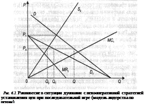 Фирма может выстраивать рыночную стратегию, уделяя основное внимание не объему продаж, а установлению цены. Этой ситуации соответствует модель лидерства по ценам. В данном случае предполагается, что фирмы производят однородный товар и продают его по одинаковой цене, устанавливаемой лидером. Для того чтобы максимизировать прибыль, ведомый оптимизирует свой объем продаж, отталкиваясь от заданной цены. Фирма-лидер понимает, что при установлении цены Р фирма-ведомый поставит на рынок количество товара Q2 = f(P). В таком случае объем производства фирмы-лидера составит Q1 = Q - Q2 где Q — общий объем продаж на рынке, или объем рыночного спроса; Q2 — объем предложения фирмы-ведомого. Таким образом, спрос на товар фирмы 1 равен разнице между общим рыночным спросом и предложением фирмы 2. Фирма-лидер, чтобы максимизировать прибыль, выберет такое сочетание цены и объема производства, при котором предельные издержки будут равны предельному доходу.