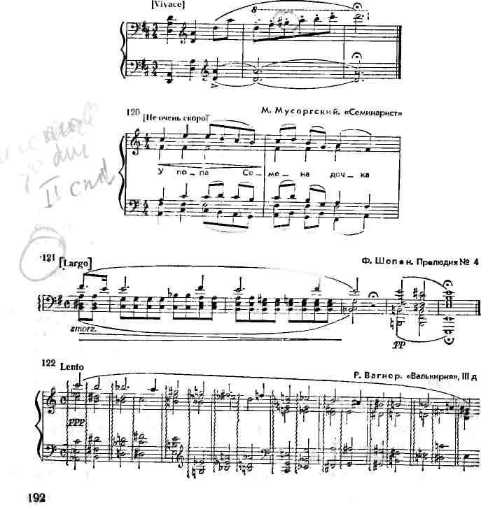 терированион субдоминантой у Листа и Чайковского, И6 в мага жоре, дезальтерация и т. п.); появляется новая альтерация, не применявшаяся классиками, — например, понижение IV ступени минора, впервые получившее особенно широкое применение у Грига. Интересно, что уже у Шопена можно встретить такое движение от IV ступени через повышенную III к III минорной, которое всем своим рисунком (нисходящая направленность! явно проходящий характер высокой III и разрешающий характер III минорной) заставляет услышать высокую III как предвосхищение понижения IV, лишь в силу традиции записываемой как терция одноименного мажора (пример 121). Во-вторых, широко используется взаимопроникновение ладов (сначала одноименных, затем параллельных). Расширяется круг трезвучий и через одновысотность (пример 122).
