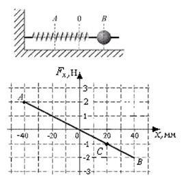 10.3. Шарик, прикрепленный к пружине и насаженный на горизонтальную направляющую, совершает гармонические колебания. На графике представлена зависимость проекции силы упругости пружины на положительное направление оси ОХ от координаты шарика. Чему равна работа силы упругости при смещении шарика из положения А в положение С?