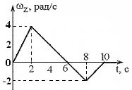 10.5. Твердое тело начинает вращаться вокруг оси Z с угловой скоростью, проекция которой изменяется во времени, как показано на графике. На какой угол (в рад) окажется повернутым тело относительно начального положения через 10 с?