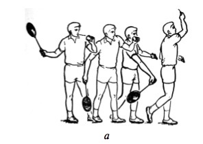 При начальном обучении подаче целесообразно использовать высокую (рис. 3, а) и низкую подачу (рис. 3, в). Подачу из высокой стойки лучше применять в парной игре (рис. 3, б). Основной способ подачи в бадминтоне – справа: тогда волан свободно выпускается из пальцев навстречу движению ракетки – волан в левой руке, ракетка в правой, левая нога немного выставлена вперед. Ракетка сначала отводится кистью назад, а затем резко выносится вперед.