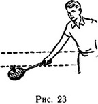При подаче ракетка движется снизу и сбоку вверх, не поднимаясь в момент удара по волану выше пояса. Верхний край рамки ракетки при ударе не должен быть выше руки, которая ее держит (рис. 23). Основной способ подачи в бадминтоне — справа. Иногда игроки применяют и подачу слева. При подаче волан свободно выпускается из пальцев навстречу движению ракетки. Волан в левой руке, ракетка — в правой. Левая нога немного выставлена вперед. Ракетка сначала отводится кистью назад, а затем резко движется вперед (рис. 24, а и б).