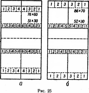 Высоко-далекие подачи выгоднее применять в одиночных встречах, о чем подробнее будет рассказано в разделе о тактике. В этом случае точность подачи отрабатывают также на площадке с разметкой, стремясь попасть воланом в полосу 60—70 см от задней линии. В последнее время как в парных, так и в одиночных встречах ведущие игроки успешно применяют плоскую длинную или плоскую короткую подачу справа. Не являясь атакующей, но будучи направлена сильным и резким ударом под левую руку, длинная и плоская подача при известном навыке является достаточно эффективной, так как вызывает определенные ответные удары. Выполняя плоскую подачу, игрок занимает место в 1, 5—2 м от передней линии подачи, вплотную к средней линии и резко ударяет по волану ракеткой почти на уровне пояса, посылая волан в задний перекресток. Только при этих условиях полет волана будет низким и быстрым, что затруднит принимающему отбивание такой подачи сильным атакующим ударом. Если принимающий, ожидая длинную подачу, отойдет ближе к задней линии, подающий может неожиданно (не отводя взгляда от середины задней линии) выполнить плоскую короткую подачу в передний угол поля подачи у боковой линии. Это будет подача с обманом. Наиболее удобныё места для выполнения подач в одиночной и парной игре уже были показаны на рис. 22, но можно подавать (по правилам) с любого места своего поля подачи (рис. 26).