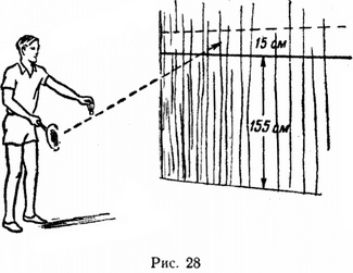 1. Промах или удар по волану, находящемуся в момент удара выше пояса. Указанные ошибки происходят при недостаточной подготовленности, невнимательности или небрежности при подаче. Подающий должен нацелить волан, дотронувшись его головкой до струн в центре рамки, затем отвести ракетку для замаха назад и одновременно поднять руку с воланом немного вверх; выпустить волан и ударить по его головке резким, отрывистым движением ракетки в направлении вперед-вверх. 2. Отрыв ступни от площадки, шаг или подпрыгивание при подаче, а также подача не готовому к ее приему противнику. Основная причина — торопливость в выполнении подач. Надо приучать себя следить за положением ног при подаче. Перед выполнением подачи проверить готовность противника к приему и правильно выбрать вид подачи. Выполняя подачу, не спешите! 3. При короткой подаче волан попадает в сетку или взлетает высоко над сеткой, давая противнику возможность сразу погасить его. Такие ошибки характерны для начинающих, не имеющих достаточного навыка в выполнении коротких подач. Ошибки устраняются путем многократного повторения короткой подачи. Эту подачу можно тренировать выполняя ее не только через сетку, а и в стену с расстояния 2, 5—3 м, как показано на рис. 28.