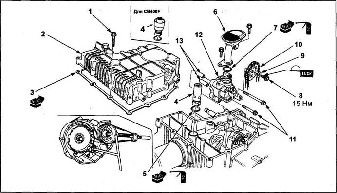 Масляный насос (снятие и установка). 1 - болт крепления масляного поддона, 2 - масляный поддон, 3 - прокладка, 4 - редукционный клапан, 5 • кольцевое уплотнение, 6 - маслоприемник, 7 - кольцевое уплотнение, 8 - болт крепления звездочки привода масляного насоса, 9 - шайба, 10 - звездочка привода масляного насоса, 11 - болты крепления масляного насоса, 12 - масляный насос, 13 -установочная втулка.