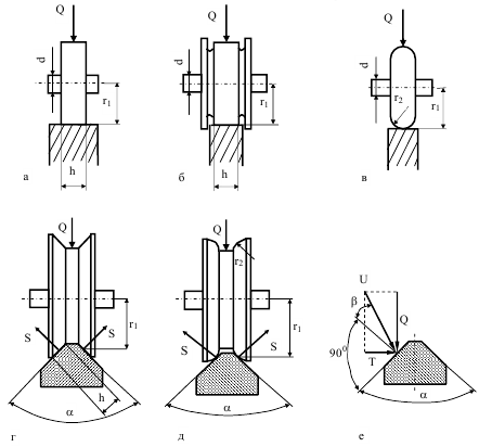 Визначення діаметра ходових коліс. Діаметри коліс та ширина обода визначаються або перевіряються розрахунком (значно частіше) на контактні напруження. Розрізняють колеса (рис2.): з лінійним контактом, коли циліндричний обід котиться по плоскій рейці; з точковим контактом, обід котрих виконаний по сфері з радіусом r2; двоконусні колеса з лінійним контактом та двоконусні колеса з точковим котактом з клиноподібною рейкою. Для коліс, що перекочуються по клиноподібній рейці (рис.2, г, д) розраховується нормальний тиск на грані рейки. Нормальний тиск S на кожну грань рейки від вертикальної реакції Q