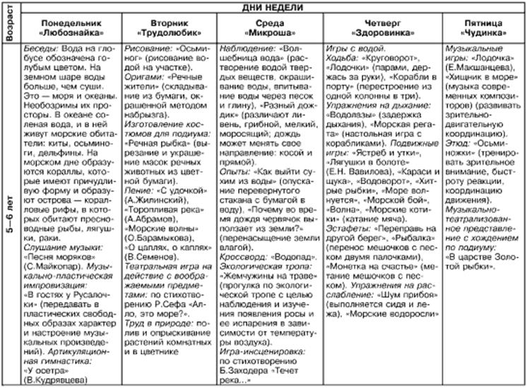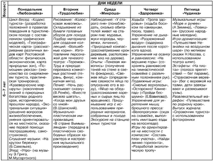 Для того чтобы лето воспринималось как время наслаждения общением с близкими и незнакомыми людьми, как радость коллективного действа, у каждого дня есть свой необычный герой, который несет «идею дня». Понедельник — «Любознайка» — знакомит с темой недели, вместе с детьми определяет круг интересов, проектирует последующую деятельность. Вторник — «Трудолюбик» — приступает к воплощению идеи через ручной труд, труд в природе, изодеятельность и конструирование. Среда — «Микроша» — наблюдает, экспериментирует, побуждает детей к открытию новых знаний, способов познания. Четверг — «Здоровинка» — активизирует, приобщает к здоровому образу жизни через эстафеты, состязания, подвижные игры. В пятницу — «Чудинка» — никакой «обязаловки», важно «заразить» детей, родителей, педагогов положительным отношением к «событиям недели», осознать важность совместного праздника. Появление и пребывание этих персонажей в группах варьируется в зависимости от возраста детей, выбранной темы, возможности педагогического коллектива. Героем может быть как педагог, так и кукольный персонаж. Совсем не обязательно присутствие героя в течение всего дня, он может периодически появляться или передавать сообщения в форме письма, телеграммы, внезапного сюрприза. Такая форма организации летнего периода работы дает возможность детям чувствовать себя раскрепощенно, усваивать познавательный материал, а вместе с ним эталоны и нормы поведения. При этом лучшим воспитателем становится радость, которую получают дети от игр, общения, от демонстрации своих способностей, от «сюрпризности». 2. Технология опыта предполагает активную образовательную совместную деятельность детей и взрослых, в ходе которой развиваются компетентности: -социальная — способности устанавливать контакты, осуществлять взаимодействие в различных социальных, в том числе больших и малых группах, участвовать в решении проблем, проявлять нравственное отношение к окружающему миру;