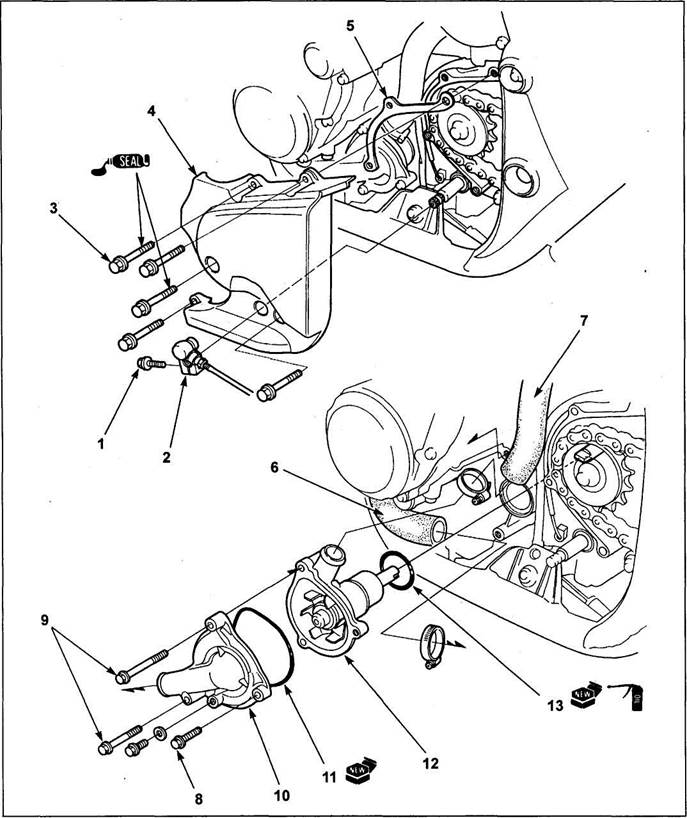 Насос охлаждающей жидкости (CB400N). 1 - болт, 2 - трос переключения передач, 3 - болт крышки привода, 4 - крышка привода, 5 - проставка, 6 - нижний шланг радиатора, 7 - шланг (от двигателя), 8 - болт крышки насоса, 9 - болт крепления насоса, 10 - крышка насоса, 11 - кольцевое уплотнение, 12 - корпус насоса охлаждающей жидкости, 13 - кольцевое уплотнение. Система охлаждения