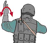 | | Если вам послышались какие-то звуки, которые теоретически могут послужить признаком присутствия неприятеля, отдайте команду «Стоп!», а затем приложите ладонь к своему уху, давая отряду понять, что необходимо прислушаться.