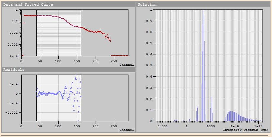Исследование квантовых точек CdS, наряду с КТ PbS является основным направлением данной ВКР. Это, прежде всего, связано с тем, что свойства данного материала при гидрохимическом синтезе хорошо изучены и, в то же время, он мало применяется для синтеза КТ. Была проведена серия опытов по получению квантовых точек в реакционной смеси следующего состава, моль/л: [CdCl2] =0.01; [Na3Cit] = 0.2; [NaOH] = 0.12; [ТМ] = 0.3. При этом последовательность сливания реактивов строго определена: к раствору хлорида кадмия добавляется раствор цитрата натрия, смесь тщательно перемешивается до растворения образовавшегося осадка и разбавляется дистиллированной водой. Далее раствор подщелачивается гидроксидом натрия и к нему приливается тиомочевина, с этого момента начинается отсчет времени реакции. Последним, в качестве стабилизирующей добавки, добавляется наиболее подходящий стабилизатор, в данном случае – трилон Б (0, 1М). Необходимый объем был определен экспериментально. Опыты осуществлялись при температуре 298 К, активация проводилась в УФ свете. Объемы добавляемых реагентов были рассчитаны по закону эквивалентов с использованием значений начальных концентраций исходных веществ. Реакционный сосуд был выбран объемом 50 мл. Механизм реакции схож с механизмом формирования тонких пленок, но в отличие от него для синтеза КТ используется более щелочная среда (pH=13, 0) и стабилизатор трилон Б, который замедляет реакцию, за счет обволакивания частиц CdS, и позволяет получать частицы малого размера (от 3 нм). В начальный момент времени раствор прозрачный, через минуту начинать отсвечивать желтым цветом. При активации в ультрафиолетовом свете раствор ярко-зеленый. При подборе оптимальных концентраций, а так же стабилизаторов (в данном случае трилон Б), раствор сохраняет размеры до 1 часа, после чего образуются агломераты и начинает выпадать осадок. Измерения проводились на анализаторе размеров частиц Photocor Compact, обработка результатов осуществлялась с помощью программы DynaLS, которая анализирует корреляционную функцию и пересчитывает на средний радиус частиц в растворе. На рис. 3.1 и 3.2 представлены интерфейс программы DynaLS, а также результаты обработки корреляционной функции измерения размеров частиц КТ CdS: