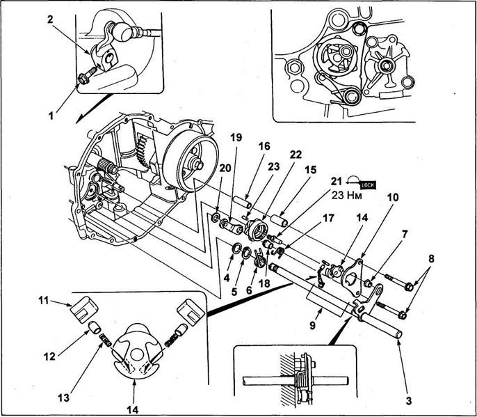 Механизм переключения передач. 1 - болт рычага переключения передач, 2 - рычаг переключения передач, 3 - вал переключения передач, 4 - упорная Шайба, 5 - стопорное кольцо, 6 - возвратная пружина вала, 7 - втулка, 8 - болт копирнои пластины, 9 - копирная пластина и направляющий кулачок в сборе, 10 - копирная пластина, 11 - собачка храповика, 12 - плунжер, 13 - пружина, 14 - направляющий кулачок, 15 - втулка, 16 - установочная втулка, 17 - пружина ограничителя, 18 - втулка, 19 - ограничитель, 20 - шайба, 21 - болт крепления барабана храповика, 22 - барабан храповика, 23 - установочный штифт. Коленчатый вал и трансмиссия