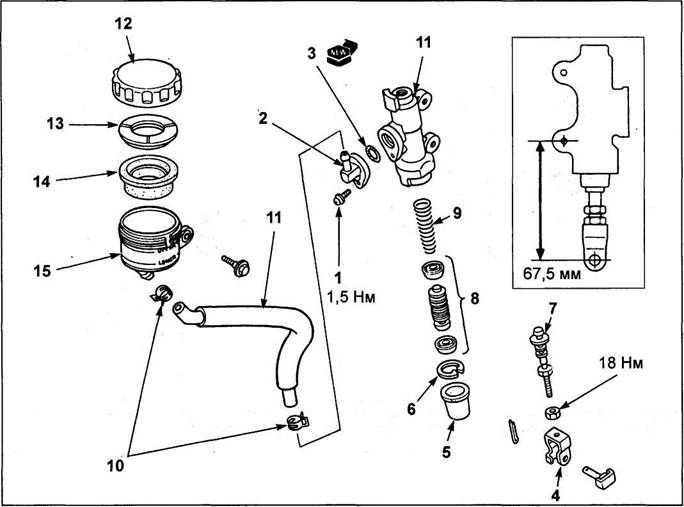 Главный тормозной цилиндр заднего тормоза (разборка и сборка, CB400N). 1 - болт крепления штуцера, 2 - штуцер, 3 - кольцевое уплотнение, 4 - наконечник штока, 5 - резиновая втулка, 6 - стопорное кольцо, 7 - шток, 8 - поршень ГТЦ, 9 - пружина, 10 - хомут, 11 - шланг бачка тормозной жидкости, 12 - крышка бачка тормозной жидкости, 13 - пластина, 14 - мембрана, 15 - бачок тормозной жидкости. Honda CB400FIIIT, CB400Flllv