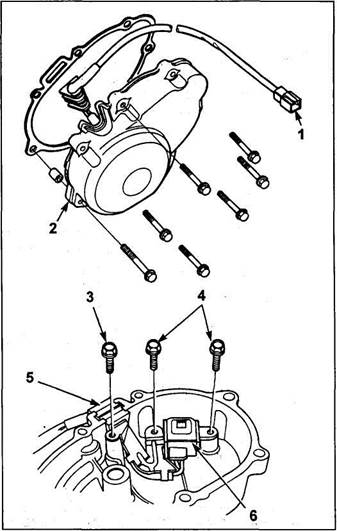 1 - разъем прерывателя (2Р), 2 - левая крышка картера, 3 - болт крепления жгута проводки, 4 - болт крепления прерывателя, 5 - предохранительная втулка, 6 - прерыватель.