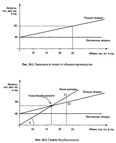 Как следует из рис. 10.1, при объеме производства 25 тыс. единиц (штук) полные затраты составят 80 тыс. ден. ед. При этом 40 тыс. ден. ед.— постоянные затраты и столько же переменные. Для определения точки безубыточности, представляющей собой такой объем производства товара, при котором предприятие возвращает все полные издержки, понесенные им в процессе производства продукции, но не получает прибыли (т.е. сумма выручки равна сумме переменных и постоянных издержек), на графике затрат следует дополнительно построить линию доходов, которая исходит из начала координат (рис. 10.2).