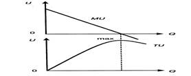 1. Спрос и полезность. Закон убывающей предельной полезности. 2. Условия равновесия потребителя на рынке (рациональный выбор потребителя). 3. Реакция потребителя на изменение дохода и цен: -линия «доход- потребление» -линия «цена- потребление» -«кривая Энгеля». 4. Эффект замещения и эффект дохода. На поведение потребителя влияют3 равнозначных фактора: · полезность блага; цена; доход потребителя. Полезность блага (utilityofgood) – это способность экономического блага удовлетворять одну или несколько человеческих потребностей. Потребитель приобретает товар, потому что, этот товар обладает полезностью. Общая полезность (ТU) - совокупная полезность всех потребляемых благ в одном непрерывном процессе; потребитель постоянно увеличивает количество единиц потребляемого блага пока не насытит потребность в нем (каждая дополнительная единица блага приносит ему дополнительную полезность). Предельная полезность, маржинальная полезность (МU) - дополнительная полезность, добавочная полезность, прибавляемая каждой последующей единицей товара. Свойства МU: 1. закон убывающей предельной полезности: предельная полезность блага убывает, т.е. полезность каждой следующей единицы блага, получаемой в данный момент времени, меньше полезности предыдущей единицы – «первый закон Госсена». Пирожки. Это происходит потому, что между количеством блага и реальной потребностью, существует обратная зависимость. Чем больше блага по сравнению с потребностью, тем меньше дополнительная потребность его последующей единицы и тем меньше цена этого блага для потребителя. Функция полезности: U= U (х, у), 2. Мах удовлетворения общей полезности достигается в т. А, когда предельная полезность становится равной нулю. Это значит, что благо полностью удовлетворяет полезность потребителя. Если дальнейшее потребление приносит вред, т.е. МU меньше 0, то общая полезность снижается (АВ). 3. МU данного блага всегда будет определяться полезностью последней имеющейся единицей этого блага. Это значит, что цена товара определяется не общей полезностью, а предельной, а поскольку МU экономического блага для потребителя снижается, то производитель может продать дополнительное количество своей продукции лишь в том случае, если снизят цену. а) б) Рис. Предельная (а) и общая (б) полезность Кардиналисты и ординалисты Количественный подход. В качестве сравнения использована условная денежная оценка полезности - ютиль. Пример: «Предельная полезность и цена благ»