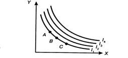 Критика количественной оценки полезности благ. Современная теория потребительского выбора (предпочтения или ранжирования). Ординалисты (порядковый подход) - отказались от поиска универсальной единицы и вместо абсолютных измерителей МU измеряли ее по предпочтению одних комбинаций товаров другими комбинациями товаров. Инструмент анализа -кривые безразличия. Кривая безразличия (КБ) показывает различные комбинации двух экономических благ, имеющих одинаковую полезность для потребителя. Очевидно, что имеются некоторые комбинации количества этих товаров, которые дают равную полезность для потребителя. Отказ от одного из этих товаров компенсируется получением другого товара в большем количестве. Множество кривых безразличия – карта КБ.