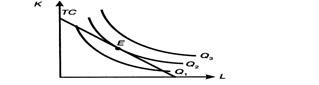 Рис. Изокванты для различных значений выпуска. Карта изоквант. Оптимальная комбинация факторов производства (правило наименьших издержек) – комбинация, при которой предельная норма технологического замещения факторов равна соотношению их предельных продуктов: MRTSLK = -Δ K\Δ L= -MPL\MPK – обеспечивает равновесие положения производителя. 1\2=5\10 сокращение использования капитала на единицу повышает его производительность (MPK) или предельный продукт, одновременно MPLпонижается. Изокоста или прямая равных издержек – линия, отражающая комбинации ресурсов, использование которых ведет к одинаковым затратам, израсходованным на производство. Рост бюджета производителя или снижение цен ресурсов сдвигает изокосту вправо, а сокращение бюджета или рост цен – влево. TC= X PL + Y PK = Lw + Kr, где L – количество труда, w – ставка рабочего (заработная плата); r- процентная ставка, т.е. цена труда и капитала.