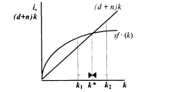 Прямая (d+n)k – показывает, сколько каждый работник должен сберегать и инвестировать из своего дохода, чтобы обеспечить будущих работников (в том числе своих детей) капитальными благами. Рост населения становится одной из причин непрерывного экономического роста в условиях равновесия.