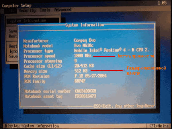 Посмотреть параметры компьютера можно также в его BIOS. BIOS - это базовая система ввода-вывода. Она присутствует на любом компьютере, ноутбуке или нетбуке. Подробнее о BIOS можно узнать из статьи " Что такое BIOS, UEFI". Напомню, что для входа в BIOS необходимо сразу после запуска компьютера нажать и удерживать клавишу Del (Delete). На некоторых компьютерах вместо Del нужно нажимать и удерживать другую клавишу (F2, F5, F4, F10 или др.). Программа настройки BIOS представляет собой списки параметров, систематизированных по разделам. Используя кнопки «вверх», «вниз», «вправо» и «влево» (клавиши со стрелками), необходимо зайти в раздел, имеющий название «System Information» (или что-то вроде этого), где и будут отображаться основные характеристики компьютера (см. изображение).