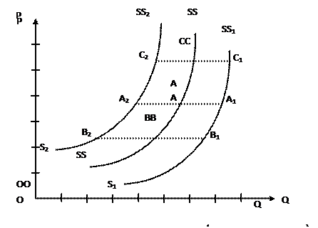 Рассматривая кривую SS, можно видеть изменение предложения, т. е. изменение количества предлагаемого товара при изменении цены (движение по кривой SS от точки A к точке B). Так как каждая из точек (C, A, B) характеризует определенные количества предлагаемых товаров по определенной цене, то при изменении цен и количеств предлагаемых товаров можно говорить об изменении величины предложения под воздействием ценового фактора. Рассматривая кривую SS, можно видеть прямую зависимость между ценой (P) и количеством предлагаемого товара (Q). Рассматривая приведенные выше факторы, влияющие на предложение, с помощью графика и кривой предложения SS, можно все случаи роста предложения представить с помощью сдвига кривой SS вправо. На графике это кривая S1 S1. Смещение предложения произошло в результате воздействия на предложение неценовых факторов. Как видно, все точки на этой кривой (A1, C1, B1) соответствуют по цене точкам A, C, B, но количество товаров, продаваемых по таким же ценам, в каждой указанной комбинации увеличилось. Другая кривая предложения S2 S2 иллюстрирует сокращение предложения в связи с влиянием неценовых факторов, в результате снижения предложения товаров по каждой заданной цене, соответствующей точкам C2, A2, B2, будет предложено меньше, что характеризуется сдвигом кривой влево. Во всех рассмотренных случаях будет изменяться не само предложение – оно либо есть, либо его нет, а величина предложения под воздействием неценовых факторов.