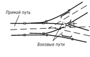 Обыкновенный одиночный стрелочный перевод: путь разделяется на два пути, один из которых идет прямо, а другой отклоняется вправо или влево. Исходя из этого обыкновенный стрелочный перевод может быть правосторонним или левосторонним (рис. 3.5а). Симметричный стрелочный перевод: основной и боковой пути отклоняются в разные стороны под одинаковыми углами от оси основного пути (рис. 3.5б). Разносторонние несимметричные стрелочные переводы: путь разделяется на два пути, которые отклоняются вбок от основного под разными углами (рис. 3.5в). Несимметричные стрелочные переводы односторонней кривизны: путь разделяется на два пути, которые отклоняются в одну сторону от основного под разными углами (рис. 3.5г). Двойной стрелочный перевод: основной путь разделяется на три. В таких стрелочных переводах тесно соседствуют две стрелки. Из-за компактности и сложности конструкции двойные стрелочные переводы используются только в тех случаях, когда необходимо организовать сложное путевое развитие в стесненных местах (рис. 3.5д). Перекрестный стрелочный перевод («английский») располагается в местах пересечения под углом двух путей. Подвижной состав может проходить прямо по любому из путей или переходить с одного пути на другой (рис. 3.5е).