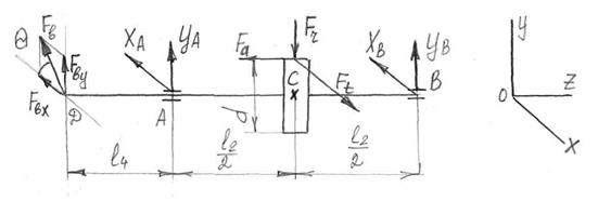 Рисунок 7.2. – Розрахункова схема вала (Fв – сила від ланцюгової або пасової передачі (див. п.6); Ө = кут нахилу передачі; для завдання 1Б сила Fв спрямована вниз).