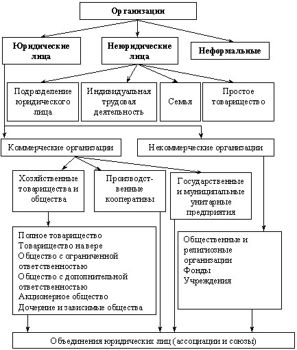 В российском обществе к государственным относятся федеральные (законодательные, исполнительные и судебные) организации. Конституцией РФ предусмотрено разграничение полномочий между органами государственной власти Российской Федерации и органами государственной власти субъектов РФ. Совокупность организаций, составляющих структуру гражданского общества, в зависимости от характера и целей их деятельности можно подразделить на коммерческие и некоммерческие. Коммерческие организации создаются для осуществления предпринимательской деятельности и подразделяются: по виду и характеру хозяйственной деятельности; по принадлежности капитала и контролю; характеру собственности; правовому положению; масштабам и сфере деятельности
