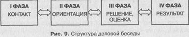 Любая беседа имеет свою динамику, то есть имеет свое начало, середину и конец. Беседа может быть короткой или длительной по времени (содержание беседы мы пока не затрагиваем — это отдель- Глава 3. Коммуникация как деятельность ный аспект). Но тем не менее все разнообразие бесед определенным образом упорядочивается. Процесс любой беседы можно разбить на этапы или фазы. Полноценная беседа в своем развитии должна пройти все четыре этапа (или фазы). На каждой фазе решаются свои задачи. Хотя деление целостной беседы на этапы достаточно условно, эти фазы реально существуют, и даже в некоторой степени независимо от других фаз. Но так же как, скажем, в развитии ребенка, если те или иные этапы пропущены или пройдены поверхностно, через какое-то время человек к ним возвращается, поскольку неразвитые функции, процессы и способности тормозят дальнейшее развитие. Аналогичная ситуация и в беседе: происходит возврат к той фазе, задачи которой не решены до конца. В этом проявляется зависимость фаз друг от друга, их взаимная обусловленность. Итак, в беседе выделяют четыре фазы (рис. 9): 1. Контакт. Цель — создание благоприятных для беседы отношений, общего эмоционального фона. 2. Ориентация. Цель — выяснение сути проблемы, интересов, позиций, точек зрения собеседников. 3. Решение, оценка. Цель — поиск вариантов решений проблемы, их оценка. 4. Результат. Цель — достижение согласованного с собеседником решения, побуждение к действиям. На каждой фазе для достижения основной цели беседы решаются свои задачи, которые будут рассмотрены ниже. Таким образом, предложенная структура деловой беседы позволяет описать процесс развития беседы. Однако, как уже отмечалось выше, если задачи какой-то фазы не решаются до конца, то собеседники возвращаются к ним. Например, можно установить контакт с собеседником в начале беседы, но потерять его на второй или третьей фазе при обсуждении проблемы. В таком случае нужно снова устанавливать контакт и стараться поддерживать его в процессе всей беседы. В этом смысле фаза контакта сквозная, то есть она проходит по всем фазам беседы, только уже не стоит на