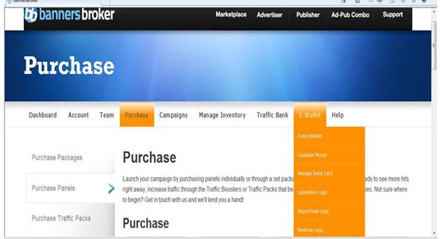 Примечание: Для того, чтобы панель начала зарабатывать, она должна быть сначала Работа Рекламных ресурсов, представленных Панелями, напоминает аренду пространства на Вебсайте. Это происходит путём выделения места на издательских сайтах по всей нашей сети. Условия аренды места основано на цвете панели, которой вы обладаете. Как только панель достигла своего максимального дохода (Traffic Cap), ваша аренда издательского пространства закончилась. Компания все еще продолжает получать доход, что позволяет ВВ быть все время прибыльной. Это место в дальнейшем может быть арендовано другим пользователем. ПОКУПКА ПЕРВОГО ПАКЕТА: Во первых вам нужно зайти в офис «Banners Brokers». Затем пойдите во вкладку, которая говорит " E-wallet". выпадающее меню говорит “Fund E-wallet”. И пополните свой кошелёк нужной сумой денег. Это можно сделать с помощью кредитной карточки или “Solid Trust Pay”. Например, если вы хотите купить зелёный пакет, тогда пополните E-wallet на 415$.