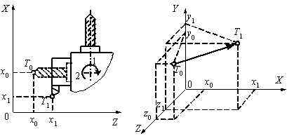 а) б) Рис. 7.2. Програмований зсув нуля (а) Більшість пристроїв ЧПУ третього покоління дозволяє виконати програмування обома методами. Однак рекомендується користуватися заданням у приростах (функція G 91), оскільки в цьому випадку зберігається пряме співвідношення між переміщенням інструмента, зазначеним у кадрі, і його фактичним переміщенням. Необхідно пам’ятати, що незалежно від того, чи переміщається шпиндель з інструментом відносно заготовки або заготовка відносно інструмента, при програмуванні передбачається, що переміщається інструмент. Траєкторія руху інструмента (еквідистанта) включає ділянки прискорених переміщень, а також ділянки лінійної або кругової інтерполяціїї, які інструмент проходить зі швидкістю робочої подачі. Спосіб руху вздовж заданої траєкторії визначається підготовчою функцією, а спосіб задання геометричних параметрів ділянки траєкторії залежить від способу руху, прийнятої координатної системи, прийнятого набору параметрів ділянки, площини обробки. Позиціонування на швидкому ходу кодується функцією G 00. На ділянці прискореного переміщення у кінцевому результаті потрібно лише потрапити в задану точку Т 1, а проміжна траєкторія несуттєва (рис. 7.3, а). Тому у випадку руху з точки Т 0 у точку T 1 запис у кадрі має вигляд: – в абсолютній системі: N { i } G 00 … G 90 X { x 1} Y { y 1} Z { z 1}… – у відносній системі: N { i } G 00 … G 91 X { x 1 – x 0} Y { y 1 – y 0} Z { z 1 – z 0}… При такому записі рух виконується одночасно по всіх координатах з максимальною швидкістю. Тому у випадку руху по трьох координатах результуюча швидкість більша за максимальну швидкість по координаті в У тих випадках, коли позиціонування доцільно виконувати з почерговим рухом по координатах, замість зазначеного кадру в абсолютній системі записують три: N { i } … G 00 … G 90 X { x 1}… N { i + 1} … Y { y 1}… N { i + 2} … Z { z 1}… Таке переміщення використовується при виконанні встановлюючих переміщень інструмента, відведеннях, підведеннях інструмента, переходах від однієї суміжної ділянки обробки до іншої, заміні інструмента тощо, коли немає контакту інструмента з деталлю і не потрібна висока точність руху на ділянці прискореного переміщення.