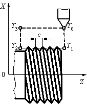 а) б) в) Рис. 7.3. Способи руху вздовж заданої траєкторії Переміщення на робочій подачі задається ділянками інтерполяції: при русі по прямій – лінійна інтерполяція, при русі по дузі кола – кругова інтерполяція. Швидкість робочої подачі задається словом “Функція подачі”. У це слово входить адреса F і величина подачі, що діє на всіх ділянках інтерполяції до її заміни. Для ділянки переміщення з точки Т 0 у Т 1 з лінійною інтерполяцією запис у кадрі має вигляд: – в абсолютній системі: N { i } G 01 … G 90 X { x 1} Y { y 1} Z { z 1}… – у відносній системі: N { i } G 01 … G 91 X { x 1 – x 0} Y { y 1 – y 0} Z { z 1 – z 0}… На ділянці лінійної інтерполяції (рис. 7.3, б) рух інструмента здійснюється з максимальним наближенням до заданої прямої Т 0 Т 1. На ділянці кругової інтерполяції (рис. 7.3, в) траєкторія руху інструмента визначається геометричними параметрами дуги Т 0 Т 1. В усіх випадках початковим положенням інструмента є точка Т 0, у яку інструмент потрапив за результатами відпрацьовування попереднього кадру. Таким чином, координати точки Т 0 вважаються відомими. Виходячи з цієї обставини, у слові “Розмірні переміщення” задають такі геометричні параметри ділянки траєкторії, при яких його просторове положення стало б визначеним. Для цього вказується напрямок руху за годинниковою стрілкою або проти неї функціями G 02, G 03, площина обробки – функціями G 17, G 18, G 19, проекції радіус-вектора дуги – розмірними переміщеннями I, J, K, та координати кінцевої точки: – в абсолютній системі: N { i } G 02 G 17 … G 90 X { x 1} Y { y 1} I { xc – x 0} J { yc – y 0}… – у відносній системі: N { i } G 02 G 17 … G 91 X { x 1 – x 0} Y { y 1 – x 0} I { xc – x 0} J { yc – y 0}… Кругова інтерполяція і відповідний рух може вестись тільки у площині двох координат XY (G 17), XZ (G 18), YZ (G 19). Всі значення координат кінцевої точки і проекції радіус-вектора необхідно задавати явно, в тому числі і нульові значення. Проекції радіус-вектора задають завжди в приростах із врахуванням знаків проекції. В пристроях ЧПУ класуCNC рух по колу може програмуватися заданням радіуса R кола і кута нахилу a початкової точки: – в абсолютній системі: N { i } G 02 G 17 … G 90 X { x 1} Y { y 1} I { a } J { R }… – у відносній системі: N { i } G 02 G 17 … G 91 X { x 1 – x 0} Y { y 1 – x 0} I { a } J { R }… Проте, спосіб задання дуги кола кінцевою точкою та центром у відносній системі найбільше розповсюджений в пристроях ЧПУ. При цьому більшість ЧПУ передбачає задання в одному кадрі інформації про частину дуги, що розташована в межах тільки одного квадранта кола, тобто рух по дузі у двох і більше квадрантах необхідно подавати декількома кадрами. Нарізання різі з постійним кроком (рис. 7.4) кодується підготовчою функцією G 33. Траєкторія руху при виконанні цієї операції буде комплексною і повинна бути записана у чотирьох кадрах: – прискорене підведення (Т 0 Т 1): N { i } G 00 G 90 X { x 1}… – нарізання різі (Т 1 Т 2) із кроком, що задається параметром K: N { i + 1} G 33 … Z { z 2} K { c }… – прискорене відведення (Т 2 Т 3): N { i + 2} G 00 … X { x 3}… – відведення по осі Z (Т 3 Т 0): N { i + 3} … Z { z 0}…