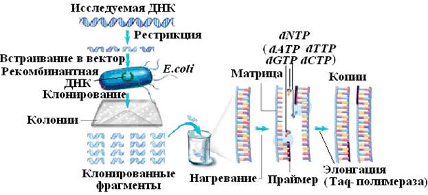 Перед секвенированием по методу Сангера молекулу ДНК разрезают на фрагменты и клонируют в Escherichia coli. Выделенные из бактериальных клеток фрагменты многократно амплифицируют с помощью полимеразной цепной реакции (рис. 35), как описано в соответствующем разделе данного пособия.