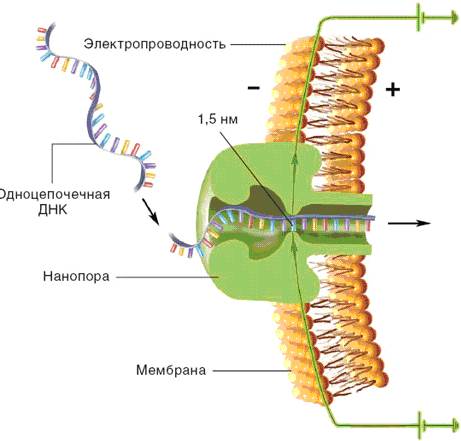 Одноцепочечную ДНК протягивают через пору диаметром 1, 5 нм, пронизывающую мембрану, и регистрируют изменение электропроводности последней по мере поочередного прохождения нуклеотидов. Каждому типу основания соответствует свое изменение электропроводности, что и позволяет прочитать нуклеотидную последовательность цепи.