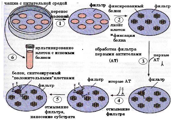 Рис. 52. Скрининг клонов трансформированных клеток E.coli с помощью специфических антител 1-6 – этапы эксперимента (описание см. в тексте)