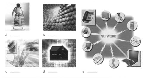 ADVANTAGES: 1. Computers save storage place. Imagine how much paper would have to be used, how many trees would have to be cut just to store information which is today on hard disks. Data stored on just one CD in paper form would use room of dozens square meters and would weight thousands of kilos. Nowadays techniques of converting data from paper into digital form have also tremendously developed. You can simply rewrite the text using a keyboard. If you are not good at it, you can use a scanner to scan necessary documents. At least there are special devices which can transfer our voice into text. Thanks to computers banks, private and government companies, libraries, and many other institutions can save millions of square meters and billions of dollars. Nowadays we have access to billions of information and due to the computer’s capabilities we actually don’t need to worry not only how to store them but also how to process them. 2. Computers can calculate and process information faster and more accurate than human. Sometimes there is false information in newspapers that due to the computer’s mistake something has failed. But it’s not truth because machines cannot make mistakes by its own. Sometimes it’s a short circuit, other time it’s a hardware problem but more often it is a human mistake, someone who designed and wrote the flawed computer program. 3. Computers improve our lives. They are very useful in the office work, we can write texts such as reports and analysis. Compared with old typewriters when using computers we don’t have to worry about making mistakes in typewriting because special programs help us to avoid them and we can change them any time. When the text is finished we can print it in as many copies as we want. At least but not at last, we can communicate with whole world very fast and cheap using the Internet. 4. Computers are user-friendly. We can watch videos and listen to music having only a PC. We don’t need a video player, TV and a stacking hi-fi any more. Furthermore, we don’t have to buy PCs which can take much room due to their other necessary components and wires. We can always buy a laptop or a palmtop which is even smaller, and use them outside anywhere we want. DISADVANTAGES: 1. Computers are dangerous to our health. The monitors used to be dangerous for our eyesight. Nowadays due to technological development they are very safe. But there are other threats to our health than damaging our sight. Working with computers and permanent looking on the monitor can cause epilepsy, especially with children. Very often parents want to have a rest and don’t draw enough attention to how long their children use a computer. This negative effects also concerns TV screen. 2. Computers sometimes brake down. The biggest problem is when our hard disk brakes down because of the data stored on it. Other hardware is easily replaceable. But there are many ways of avoiding consequences of loosing our data, for example by saving it on CDs. Except hardware failures there are also software ones. For example, for many years Windows Operating System was very unstable and that’s why many other OS were written. Now the most common are Linux, Windows XP, MacOs (for Macintosh computers). Except of unstable OS another and maybe the main threat to our data are computer viruses. There are billions of them and every day new ones come into being. If you have the Internet connection you have to be particularly careful and download anti-virus programs. Fortunately, there are also many of them and most of them are freeware. You have to remember to download updates. 3. Violence and sex. The main threats for younger users of computers are the Internet pornography and bloody games. The presence of sexual content or the level of violence should be properly marked and parents are obliged to draw their attention to this issue. There are many extremely bloody games such as «grand theft auto», «quake» etc. For example, in GTA you are a member of mafia and to promote in crime hierarchy you should kidnap people, steal cars, robe banks etc. As a bonus you can also run over pedestrians. There are also many games in which you are a soldier and your mission is to kill as many enemies as possible. The other threat to our children is the Internet pornography. The availability of sexual content is enormous and you can do practically nothing to protect your child, especially when it’s interested in this matter. 4. The other threat is that you can be a computer addict. If you spend most of your free time using computer you should go to see a psychologist. Part 3 Future trends in computing Exercises to the subject: I. Discuss the questions: 1. What do you think a trend is? II. Match the texts (1-5) with the pictures (a-e). Which trends from your list are mentioned? 1) By all accounts, nanotechnology – the science of making devices from single atoms and molecules – is going to have a huge impact on both business and our daily lives. Nano devices are measured in nanometres (one billionth of a metre) and are expected to be used in the following areas: - Nanocomputers. Chip makers will make tiny microprocessors with nanotransistors, ranging from 60 to 5 nanometres in size. - Nanomedicine. By 2020, scientists believe that nano-sized robots, or nanobots, will be injected into the body’s bloodstream to treat diseases at the cellular level. - Nanomaterials. New materials will be made from carbon atoms in the form of nanotubes, which are more flexible, resistant and durable than steel or aluminium. They will be incorporated into all kinds of products, for example stain-resistant coatings for clothes and scratch-resistant paints for cars. 2) Artificial Intelligence (AI) is the science of making intelligent machines and programs. The term originated in 1940s, when Alan Turing said: “A machine has artificial intelligence when there is no discernible difference between the conversation generate