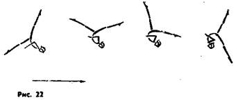 Начало упражнения на снарядах принято определять терминами: с прыжка, с разбега, из виса, из упора, из упора на руках и др. В отдельных случаях для краткости можно сразу называть начальное движение (первый элемент). Например, размахивание (на перекладине) и подъем разгибом — оборот назад. Подъем — переход в упор из виса или из более низкого упора в более высокий. Различают: подъем силой поочередно (рис. 21, а), подъем силой (рис. 21, 6), махом одной подъем переворотом (рис. 21, б), то же махом или силой, подъем правой (левой) или двумя (рис. 21, г), подъем разгибом и др. Спад — движение, противоположное подъему. Медленный спад принято называть опусканием. Оборот — круговое движение гимнаста вокруг оси снаряда (перекладина, жердь и др.), выполняемое из упора. Различают: оборот вперед (назад) из упора ноги врозь, оборот вперед или назад из упора, большой оборот. Поворот — движение тела вокруг вертикальной оси. Различают поворот махом вперед, назад, поворот в стойке и др. Стойка — вертикальное положение гимнаста ногами кверху с опорой какой-либо частью тела. Различают: стойку на плечах, на руках, на одной руке и др. Способы выполнения стоек: силой, махом, согнувшись, прогнувшись и др. Мах — свободное движение относительно оси вращения. (Способы: силой, изгибами, с прыжка. Размахивание — мах, выполненный несколько раз. Мах дугой — переход из упора в вис дугообразным движением. Кач — однократное маятникообразное движение занимающегося вместе со снарядом (обычно с кольцами). Несколько качей — раскачивание. Выкрут — оборот тела вокруг горизонтальной оси с вращением в плечевых суставах при фиксированном хвате. По направлению различают выкрут вперед и назад. При необходимости указывают мах, которым он выполняется. Для обозначения маховых движений (махов) применяются термины: Перемах — движение ногой (ногами) над снарядом. Круг — целостное (эллипсообразное) движение ногой (ногами). Различают: круг правой, круг правой влево, влево или вправо назад, круг с поворотом и др. Круг двумя, выполняемый с сомкнутыми прямыми ногами; круг поперек, крут прогнувшись и др. Скрещение — два встречных перемаха. Разновидности скрещений уточняются. Например, скрещение согнув ноги, обратное скрещение, скрещение с поворотом. Вход — термин, обозначающий переход гимнаста из и. п. у снаряда круговым движением с поворотом вокруг опорной руки в упор на ручках. Может быть выполнен одной ногой (ее указывают). Переход — смещение исполнителя вправо или влево на снаряде с перехватом руками (при выполнении того или иного элемента). а Выход — движение, противоположное входу, но на другую часть коня. Перелет — перемещение гимнаста с одной стороны снаряда на другую с опусканием рук (углом, согнувшись, ноги врозь и др.), а также с одного снаряда на другой или с одной жерди на другую. Соскок — спрыгивание со снаряда из виса или из упора. Различают: соскок махом вперед, назад, то же с поворотами, дугой, оборотом, переворотом, выкрутом, сальто и др. А также согнув ноги, ноги врозь (из упора и из стоек на руках). Прыжок — преодоление расстояния: высоты, длины, препятствия или снаряда — в свободном полете после отталкивания ногами. Опорный прыжок выполняется с дополнительной опорой (толчком) руками. Различают: прыжок согнув ноги, ноги врозь, боком, углом, переворотом и др. Замах — предварительный мах ногами н
