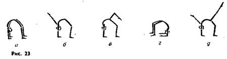 жения уточняются. Например, вис на согнутых ногах (рис. 18, 5). Упор — положение занимающегося, в котором его плечи выше точек опоры (см. рис. 1). Различают упоры простые и смешанные. Упоры простые: упор, упор на предплечьях, на руках (см. рис. 1, а, б, в), упор на руках согнувшись (рис. 19, а), упор сзади (рис. 19, б), упор углом (рис. 19, в). В случаях очевидного положения в упоре достаточно применять одно слово «угол». Например (на брусьях), подъем махом назад — махом вперед угел или перемахом правой (над правой жердью) угол; упор ноги врозь вне (рис. 19, г). Упоры смешанные: упор присев на правой, левую назад (или назад на носок, рис. 20, а), упор лежа на согнутых руках, левую назад (рис. 20, б), упор стоя ноги врозь (рис. 20, в) и др.