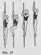Лазанье выполняется в смешанном висе и в висе на одних руках. На занятиях следует чередовать эти способы, учитывая их преимущественное воздействие на мышцы рук и плечевого пояса или ног. Кроме того, при лазанье в смешанном висе значительно улучшаются условия для дыхания. Упражнения в лазанье развивают силу, ловкость, смелость, повышают у занимающихся уверенность в своих силах, совершенствуют координационные способности. Лазанье в смешанном висе и упоре Упражнения в лазанье на гимнастической стенке: а) лазанье вверх, вниз, передвижение в стороны с поочередным б) то же, но с одновременным перехватом руками; в) передвижение прыжками вверх, вниз и в стороны с перехва г) лазанье спиной к стенке. Лазанье по канату Существует три способа лазанья в смешанном висе по вертикальному канату: лазанье в висе на согнутых руках и лазанье в три и два приема. Лазанье в три приема. И. п. — вис на прямых руках. 1 — согнуть ноги вперед и захватить канат стопами (подъемом одной и пяткой другой ноги). Можно закреплять канат петлей. В этом случае он должен проходить снаружи бедра и голени одной ноги и прижиматься внутренней частью стопы (способ захвата каната зависит от его жесткости и толщины: тонкий и мягкий канат можно захватывать петлей). 2 — не ослабляя захвата ногами, разогнуть их (отталкиваясь) и согнуть руки. 3 — поочередно перехватить руки вверх и принять и. п., не отпуская захвата каната ногами (рис. 37). Лазанье в три приема применяется в занятиях с женскими группами и группами детей среднего школьного возраста, так как нагрузка падает не только на мышцы рук и плечевого пояса, но и на мышцы ног. При обучении этому способу лазанья целесообразно хорошо усвоить приемы лазанья на вертикальной лестнице. Для облегчения усвоения приемов лазанья на канате можно рекомендовать следующие упражнения: 1. Вис на канате на прямых руках и раскачивание в висе (вис после толчка ногами или небольшого разбега). 2. Разучивание захвата ногами, сидя на скамейке. 3. Захват ногами каната в положении виса на прямых руках. 4. Из виса сидя на полу ноги врозь подтягиваясь и опираясь пятками о пол, вис лежа на согнутых руках. Лазанье в два приема. Существует два варианта лазанья по канату в два приема.