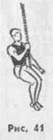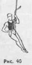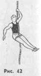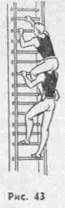 Завязывание петлей на бедре (рис. 40). И. п.— вис на прямых руках, канат между ногами. Подняв ноги вперед и зажав между ними канат, повиснуть на одной руке, а другой рукой взять канат снизу и соединить его с верхней частью каната на уровне подбородка. Одну руку освободить. То же завязывание можно проделать, подведя канат под обе ноги (рис. 41). Завязывание восьмеркой (рис. 42). И. п. и первые действия те же, что и при завязывании петлей на бедре, но поднятый нижний конец каната, обвивая бедро, пропускается между ногами вниз. Затем, сменив положение рук, канат снова поднять (но уже с другой стороны) и снова опустить между ногами. В итоге обе ноги находятся в петлях. Одну руку можно опустить. Лазанье с партнером Это наиболее сложный вид лазанья, требующий хорошей физической подготовленности и надежного оборудования. Проводится он на гимнастической лестнице, устанавливаемой в вертикальном и наклонном положениях, на канате и шесте. На лестнице или канате можно проводить лазанье с партнером, сидящим на плечах (рис. 43) или спине (рис. 44). При лазанье по канату партнер должен сидеть на плечах, зацепившись носками за спину, и помогать нижнему, выполняющему упражнение в три приема, подтягиваясь на руках (рис. 45). Перелезания Выполняются перелезания в висе (например, с каната на канат, с лестницы на лестницу), в упоре и из виса в упор и обратно. Так, на наклонной или горизонтальной лестнице выполняются перелезания с верхней стороны на нижнюю и обратно: ногами вперед, головой вперед, переворотами в упор, подъемами силой, опусканиями вперед из упора и т. д.