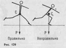 мейки, ставя на них при повороте маховую ногу на носок (рис. 127). Поворот на 360° на одной ноге. Из стойки продольно нужно сделать шаг правой в сторону и, слегка приседая на ней, встать на носок, отталкиваясь одновременно другой ногой. Помогая руками вращению, сохранять прямое вертикальное положение тела Заканчивая поворот, встать на всю стопу, левую в сторону. Повороты в приседе на одной ноге, другая в сторону. Вращение начинается с принятия позы за счет толчка ногой, закручивающего движения туловищем и руками, и последующего маха ногой в сторону вращения. При обучении угол поворота следует увеличивать постепенно. Повороты в смешанных упорах — большей частью вспомогательные элементы, служащие для изменения положения на бревне и для переходов из седов в стойку на ногах: из упора и упора сзади одноименные перемахи с поворотом в сед ноги врозь или на бедре; из седа ноги врозь скрещение махом назад с поворотом кругом; из упора сзади поворот на 270° в упор присев на одну ногу (рис. 128), поворот кругом и более в упоре углом ноги врозь вне (простой упор) и др. К передвижениям относятся различные виды ходьбы, бега, прыжков, танцевальных движений. Ходьба включает обычный шаг, с носка и на носках, с высоким подниманием согнутых и прямых ног вперед, может выполняться спиной и боком вперед, приседая и вставая, с поворотами и т. д. Бег, за некоторым исключением, состоит из сходных по форме с ходьбой вариантов движений. Критерием, определяющим содержание упражнений в беге, служит относительная их безопасность. Танцевальные движения. К ним принадлежат приставные и переменные шаги (вперед, назад, в стороны), шаги польки, вальса, мазурки, русский шаг и др. Прыжки могут выполняться на месте и с продвижением в различных направлениях на одной и двух ногах, толчком одной и двумя ногами с приземлением на одну и обе ноги. Наиболее трудными считаются прыжки с поворотами в фазе полета. Прыжки бывают одиночными или выполняются слитно друг за другом. Руки при этом могут занимать различные положения и совершать движения. Для устойчивости приземления (в прыжках на бревне и соскоках) следует своевременно начинать торможение, включая в действие мышцы не только ног, но и туловища. Опора при прыжках должна носить стопорящий характер и начинаться до того, как линия тяжести приблизится к площади опоры (рис. 129). Для отработки отдельных фаз прыжка можно при обучении пользоваться опорой руками у гимнастической стенки. В программу для школ входят наиболее простые виды прыжков: подскок на одной ноге с шага, другую назад или вперед, на месте со сменой положения ног, прыжки с одной ноги на другую на месте и с продвижением вперед, прыжки шагом, прыжки на месте, сгибая ноги и т. п. Рассмотрим некоторые из прыжков начальной подготовки. Прыжок толчком со сменой положения ног выполняется из стойки на носках. Слегка приседая, подпрыгнуть вверх, разгибая ноги и оттягивая носки. В прыжке сменить положение ног и приземлиться на напряженные, чуть согнутые ноги. Прыжок толчком двумя с разведением ног. Техника прыжка и приземления аналогична предыдущему прыжку, но в полете широко развести ноги, одну вперед. Тот же прыжок можно делать меняя положение ног к моменту приземления. Прыжок с обеих ног на одну исполняется как и предыдущие, но с приземлением на одну ногу (с носка на всю стопу), а также с про