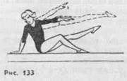 ской скамейке. Отдельно на бревне освоить перехват руками сверху вниз скользящим движением в момент касания головой снаряда. Кувырок можно заканчивать в разные положения: в сед ноги врозь или на бедре, в присед на одной или двух ногах, в стойку на колене. Страховать нужно при захвате бревна снизу двумя руками сбоку за поясницу и бедра, а без перехвата — одной рукой за плечо, другой под бедро (рис. 132). Соскоки в период начального обучения служат для воспитания у занимающихся ориентировки в пространстве, умения управлять движениями звеньев тела, совершенствования навыков приземления. Последовательность разучивания соскоков примерно следующая. Соскоки из седа на бедре с опорой рукой спереди, сзади, с поворотами кругом; соскоки из упора ноги врозь одной ногой с перемахом ноги вперед или назад; то же из упора ноги врозь поперек в сторону (махом назад или вперед); соскок из упора на колене махом другой ногой назад; то же из упора присев на одной — прогнувшись; соскок из седа углом опорой одной ногой (рис. 133). Соскок махом ноги (прогибаясь) выполняется с шага или разбега, с конца бревна или с середины — в сторону; соскок прогнувшись толчком ног из стойки поперек (с конца бревна или в стороны) и из стойки продольно; то же с поворотами, ноги врозь, группируясь, согнувшись, сог-гнув ноги назад. Далее трудность соскоков возрастает: соскоки переворотом в сторону, то же после поворота в стойке на руках (в конца бревна); соскок переворотом вперед (медленный и в темпе); соскок переворотом в сторону с конца бревна (выполняется соединяя ноги в етойке на руках. Продолжая движение ногами и передавая тяжесть на вторую руку, оттолкнуться ею в момент потери равновесия и, сохраняя вытянутое положение тела в полете, мягко приземлиться. Этот же соскок можно выполнять и в середине бревна. Страховать поддерживая гимнастку за плечо и поясницу рис. 134). Обучение этим соскокам следует начинать на гимнастической скамейке и низком бревне, переходя затем на коня без ручек и обычное бревно. Высоту снаряда при обучении повышать постепенно.