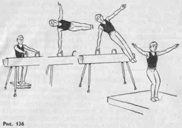 численных фаз отрицательно сказывается на исполнении прыжка в целом. Завершающие действия гимнаста в одной фазе прыжка всегда являются подготовительными для выполнения последующей фазы. Техника выполнения мужских и женских прыжков принципиально не отличается. Разбег. У высококвалифицированных гимнастов скорость разбега достигает 7, 6—8, 6 м/с. Разбег должен быть равномерно ускоренным. Значительные колебания скорости разбега отрицательно влияют на качество выполнения толчка ногами, так как изменяют условия отталкивания. Чтобы избежать этого, гимнастам необходимо: а) начинать разбег из одного и того же исходного положения; б) не изменять (на данный период подготовки) длину разбега; в) скорость разбега увеличивать постепенно, так как резкий старт вызывает скованность движений. Длина разбега зависит от снаряда, через который выполняется прыжок, вида прыжка, степени овладения техникой и др. У начинающих длина разбега обычно не превышает 8—12 м. Техника беговых шагов принципиально ничем не отличается от техники бега на короткие дистанции в легкой атлетике Наскок на мостик выполняется в момент приобретения наибольшей горизонтальной скорости. Снижение скорости перед напрыги-ванием на мостик отрицательно сказывается на результате прыжка и свидетельствует о неправильном выполнении разбега. В момент наскока туловище слегка наклоняется вперед (от 5 до 26°), ноги «обгоняют» туловище, согнутая в тазобедренном и коленном суставах толчковая нога подтягивается к маховой, затем ноги соединяются и по'ГГй. прямые выносятся вперед. Наскок на мостик продолжается 0, 27- О^ЗЗ с. При этом руки из крайне заднего положения начинают двигаться вниз-вперед и в момент касания ногами мостика находятся внизу. Это важно для выполнения последующего взмаха руками. Чем зыше скорость разбега, тем дальше ставят мостик от снаряда (на расстоянии 50—100 см). Толчок ногами. Прыжок на кюстик произзодится на носки напряженных, почти прямых ног без перехода на всю ступню. Ноги на мостике располагаются параллельно, на расстоянии ширины стопы. Лучшие гимнасты-прыгуны ставят ноги на место толчка акцентированно. С этой целью они в конце прыжка на мостик активно разгибают ноги в коленных и тазобедренных суставах и производят подошвенное сгибание стоп. Неквалифицированные спортсмены пассивно ждут момента приземления. При акцентированной постановке ног отталкивание длится 0, 09—0, 12 мс, а при неакцентированной — 0, 15—0, 18 с. Толчок ногами и взмах руками заканчиваются одновременно. В момент окончания толчка ноги полностью выпрямляются в коленных суставах. Спина округлена. Тело гимнаста слегка наклонено вперед (15—20° от вертикали). Полет до толчка руками. В полете уже нельзя изменить траекторию о.ц.т тела. Движениями в полете спортсмен может изменить только позу тела и положение его отдельных частей относительно о.ц.т. В этой фазе спортсмен выполняет предварительный мах ногами назад, разгибаясь в тазобедренных суставах до слегка прогнутого положения. Замах выполняется до опоры руками и способствует созданию условий для резкого сгибания тела в тазобедренных суставах в момент толчка руками. Время полета до толчка руками обычно колеблется в пределах 0, 20—0, 45 с. Толчок руками. Отталкивание руками в опорных прыжках представляет собой сложный комплекс взаимосвязанных между с