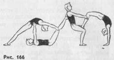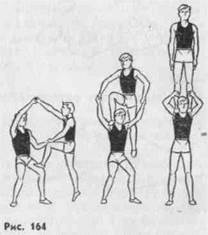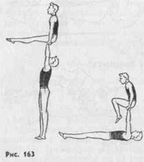 Упоры согнув ноги и углом у лежащего и стоящего партнера (рис. 163). Эти упоры позволяют освоить основные хваты руками, движения для сохранения равновесия. Сход на пол можно выполнять медленно, силой, а также броском с фазой полета. Стойка ступнями на плечах. Партнеры должны научиться свободно выполнять вход на плечи и непринужденно стоять на них. Вход с бедра (рис. 164). Наиболее простой способ входа. Нижний, поднимая руки, тянет ими партнера на себя. Верхний, стараясь все время находиться ближе к нижнему и подтягиваясь руками вверх, перешагивает с бедра на противоположное плечо и ставит ногу на другое плечо. Верхний стоит на плечах носками, опустив сомкнутые пятки вниз, голенями опирается о голову нижнего, колени слегка согнуты. Нижний держит верхнего за икроножные мышцы, прижимая голени к голове, локти разводит в стороны, грудь стараетея приподнять вверх. Верхний слегка наклоняется всем телом вперед; нижний, наклоняя голову назад, сдерживает верхнего от падения вперед. Сход верхний делает вперед, опираявь на руки нижнего или