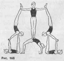 По количеству участников и технической сложности разнообразие пирамид безгранично. Наиболее популярны в школах, низовых коллективах физической культуры пирамиды с участием трех («тройки»), четырех («четверки»), пяти («пятерки»), шести («шестерки») человек (рис. 165—168). 12.2.6. Бросковые упражнения' Обучение бросковым упражнениям и индивидуальным акробатическим прыжкам взаимосвязано. Часто бросковые упражнения используются для овладения аналогичными индивидуальными прыжками и наоборот. Полупереворот назад со спины с подбрасыванием нижним за ноги (рис. 169). Верхний, приняв исходное положение, вытягивает ноги вверх, затем сгибает, тотчас же резко выпрямляет их вверх и отталкивается руками от пола. Нижний направляет бросок вверх и от себя. Кувырок назад по спине партнера (рис. 170). Партнеры захватывают друг друга под плечи. При выполнении нижний спиной толкает партнера вверх, а верхний отталкивается ногами.