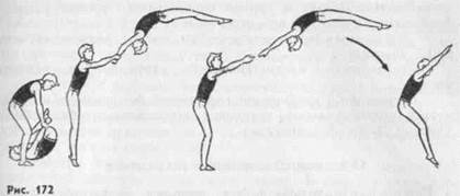Перевороты через партнера. Перевороты через партнера представляют обширную группу упражнений с большим диапазоном трудности. К простейшим упражнениям относится переворот с опорой плечами о руки лежащего партнера (рис. 171), который выполняется с одной и обеих ног; на две, на одну ногу; быстро, мед-